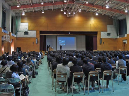 校外での発表も行われているが、2014年11月15日(土)に本校体育館で、全校生徒の参加のもとで開かれた校内発表会に出席した。 |