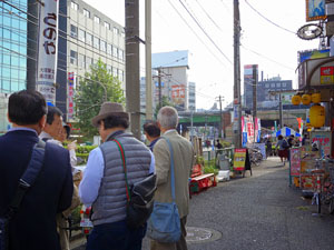 大塚といえば、都内最後の都電が走っている場所。 案内人から1916年(大正5年)の地図が配られ、見慣れた大塚駅北口で、旧王子電気軌道と谷端川の説明を受ける。 大塚駅前のビルの1階に滝不動がある。 こんな所に