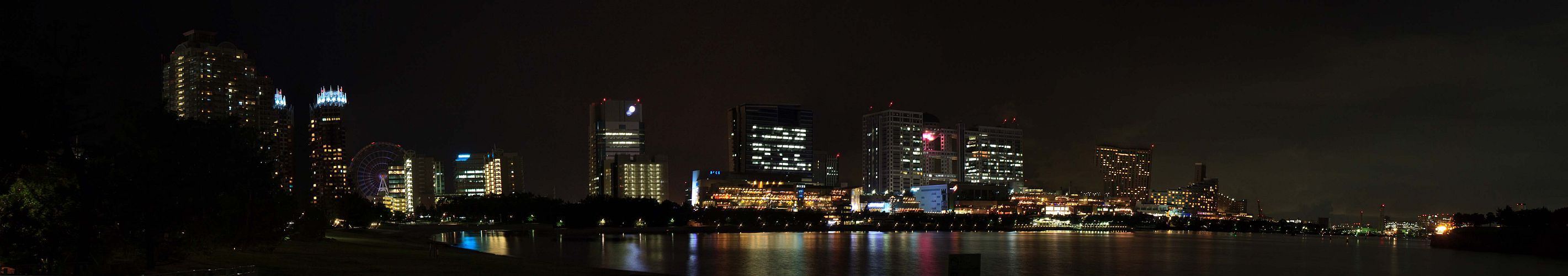 022 鈴木さんの作品です お台場パノラマ(スクロールしてご覧ください):台場公園方向から見たお台場海浜公園のパノラマです。 中心にフジTV、左側に観覧車が写っていますが、10時を過ぎていたので観覧車のライトアップは終了していました。