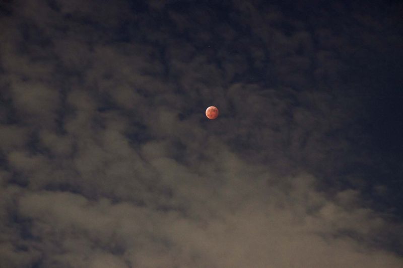 月と雲:皆既蝕の月が宇宙に浮いているように錯覚します。拡大すると月の周囲に星が見えます。