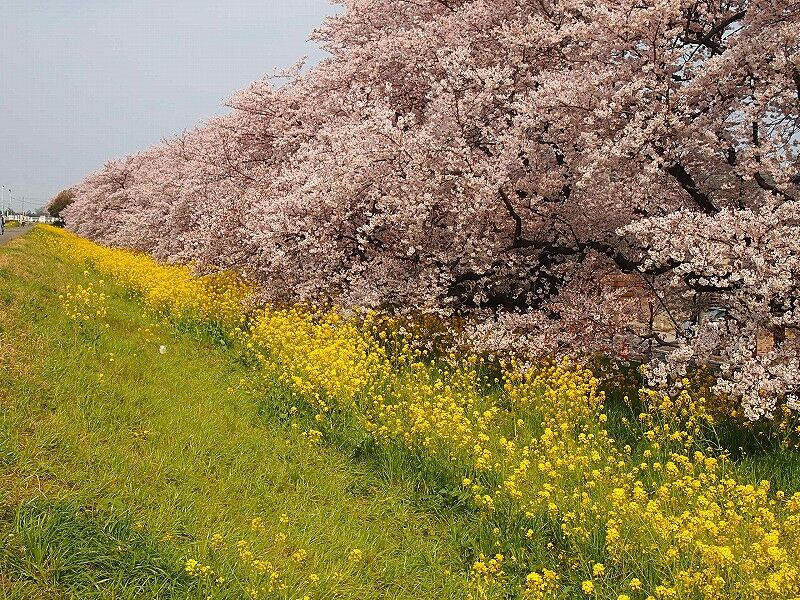 熊谷の荒川桜堤:菜の花と桜並木が延々と続く。4月5日撮影。まさに桜は満開でした。