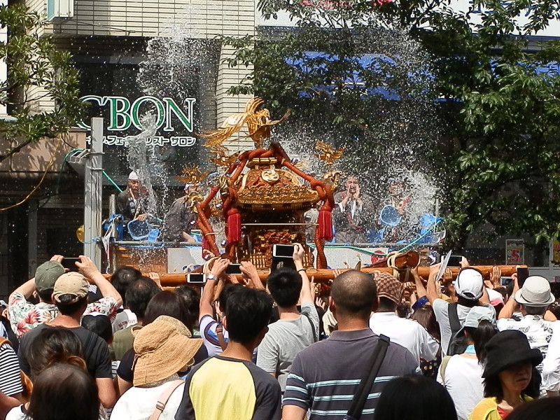 最終ゴールに近い門前仲町付近での神輿への激しい水かけ風景。
