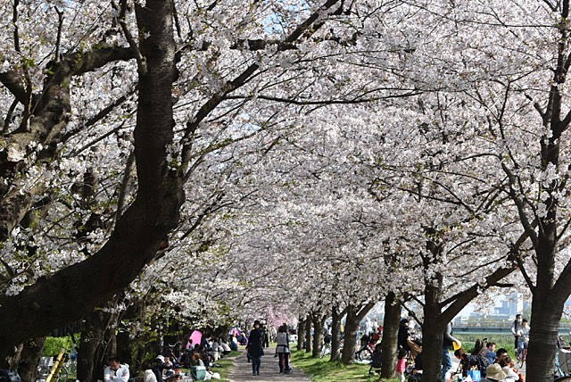 多摩川の桜:桜の木が成長し、桜のトンネルがかなり長くなりました。