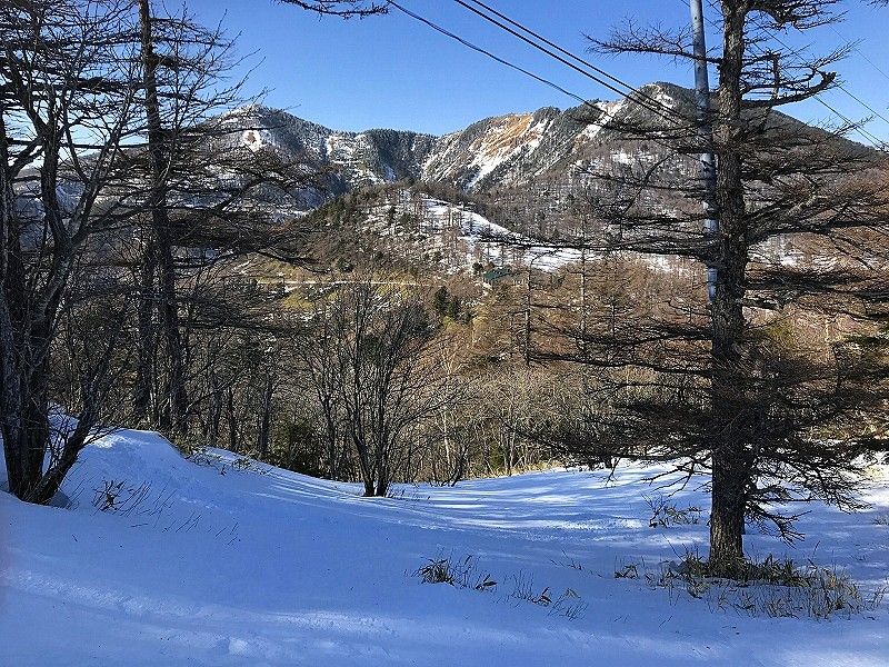 高峰温泉:水ノ塔山や篭ノ登山の中腹の一軒宿、写真真ん中わずかに緑色の屋根が見える