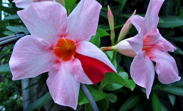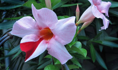 019 高橋さんの作品 回転する花 : キョウチクトウ科のマンデビラ 回転しているように見える花は他にもありますが、実際に回転する花は、極めて希なこと。 もちろん くるくると廻るわけではなく、一日に 45〜50度 回転します。 6月6日 17時30分 ↓↓ 6月8日 10時19分