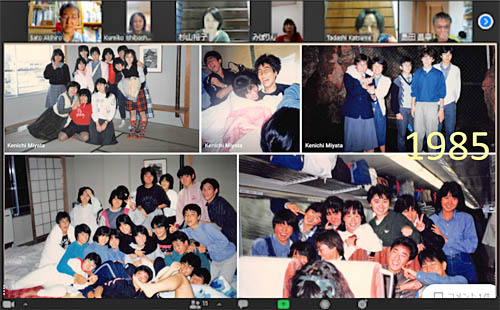 そして、当時の写真を画面共有すれば、若かりし頃から走馬灯のごとく時が流れ、一気に今現在の私たちの映像に繋がります。リアルな世界では味わえない不思議な空間で私たちは時を満喫することができました。 |